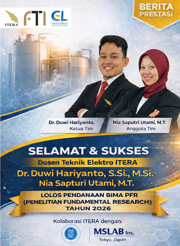 Program Studi Teknik Elektro Institut Teknologi Sumatera (ITERA) kembali menorehkan prestasi melalui keberhasilan dosennya dalam meraih pendanaan riset nasional. Dr. Duwi Hariyanto, S.Si., M.Si. (Ketua) bersama Nia Saputri Utami, M.T. (Anggota) dinyatakan lolos Pendanaan BIMA skema Penelitian Fundamental (PFR) tahun 2026. Penelitian yang diusung berjudul “Studi Konseptual dan Analisis Termo-Fluida Sistem Penyimpanan Energi Listrik Terbarukan Berbasis Garam Cair” dan dilaksanakan melalui kolaborasi internasional dengan Institut Teknologi Bandung serta MSLAB Inc..